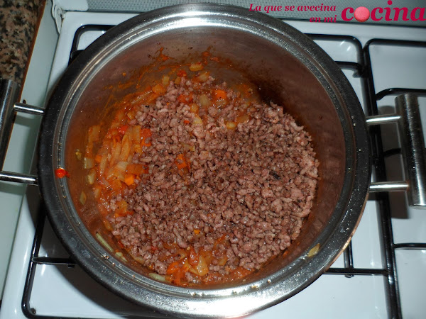 Mientras que se va haciendo no podemos parar de moverla con un cucharón de madera o con una espumadera, ya que sino se nos puede quemar. Además así podremos ir demenuzándola con el mismo utensilio. Una vez tengamos toda la carne bien hecha, la salpimentamos y la reservamos.