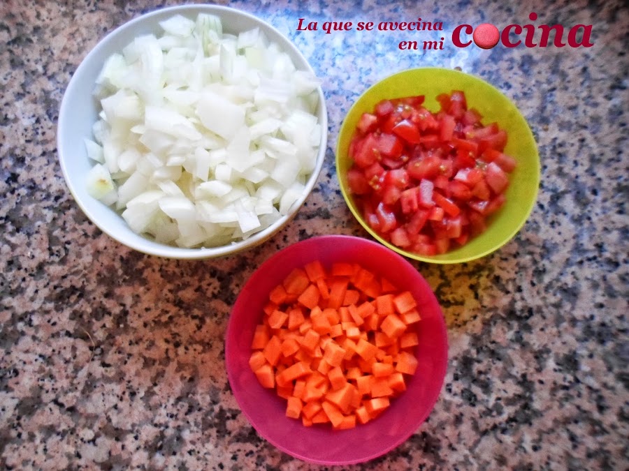 A continuación picaremos las verduras y comenzamos a sofreirlas. Empezaremos echando un poco más de aceite en el fondo de la cacerola y a pochar la cebolla un par de minutos. En ese momento añadiremos la zanahoria y el tomate y dejamos hasta que veamos que la cebollita empieza a transparentarse.