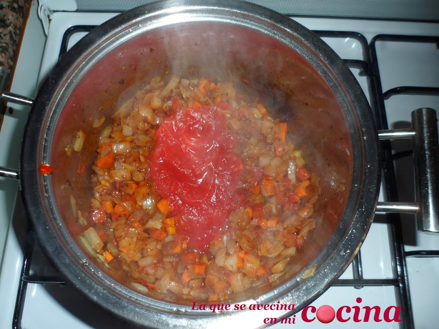 Añadimos el tomate triturado, removemos.