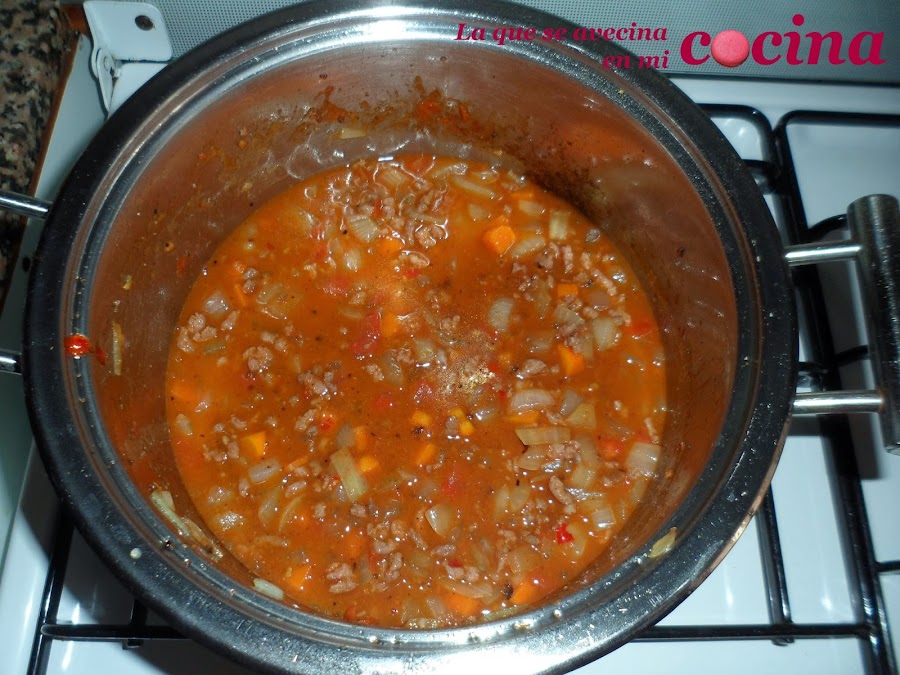 Cuando veamos que todo esté intregado le agregamos el caldo de carne. A ver, yo he puesto 300 ml. pero yo comienzo poniendo la mitad, unos 150 ml. y dejo que se vaya haciendo. Vamos dándole algunas vueltecitas de vez en cuando y cuando vayamos viendo que se nos va secando le añadimos de nuevo un poco de caldo. Es decir, es un poco "a ojo" pero yo os he puesto 300 ml. porque entre todas la veces que le agregué caldo se me quedó en esa cantidad. Tened en cuenta que debe estar al fuego una hora aproximadamente, de ahí que tengamos que tener cuidado de que no se nos quede sin caldo.
