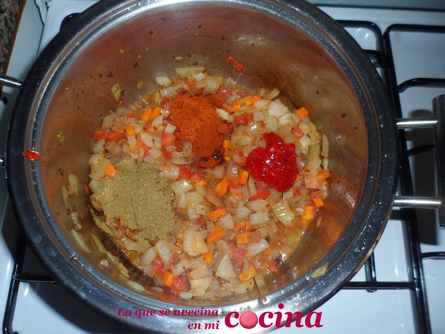 Luego iremos preparando nuestras especias para agregar. Como ya os dije una cucharada de cada cosa. A mi personalmente es que me gusta bien picantito, pero si os gusta más flojo sólo tenéis que rebajar estas cantidades y quizás echar sólo media cucharada ;) Lo agregamos a la cacerola y removemos bien.