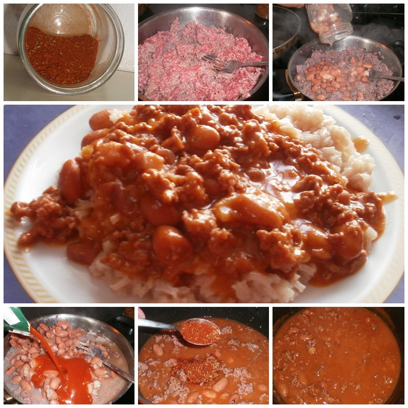 Rehogar la carne, añadir el bote de alubias, 1 brick pequeño de tomate frito, 1/2 bote de agua, 1- 2 cucharaditas de sazonador chili y cocer a fuego lento mínimo 30 minutos.