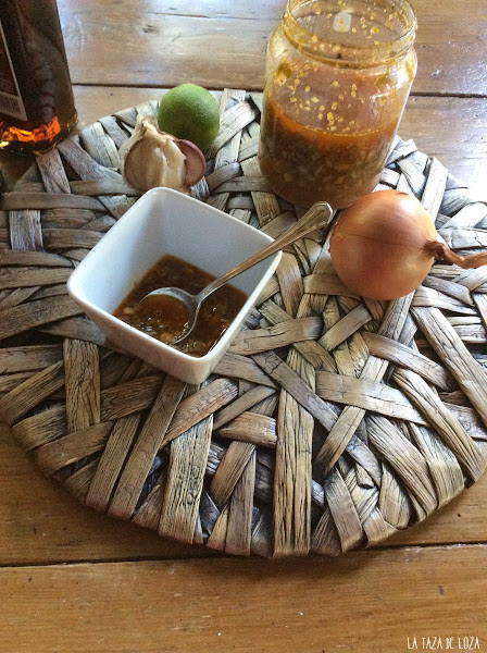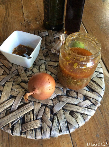 Ponemos primero la medida de la taza de agua a hervir con dos cucharadas de sal gruesa. Dejamos que hierva y que se disuelva la sal. En un recipiente ponemos todas las hierbas secas con la cebolla, los dientes de ajo, el ají o guindilla todo cortado pequeñísimo y el zumo de limón y encima de todo esto echamos la salmuera que acabamos de preparar y debemos echarla caliente. Se deja media hora y se añade el aceite de oliva y el vinagre.