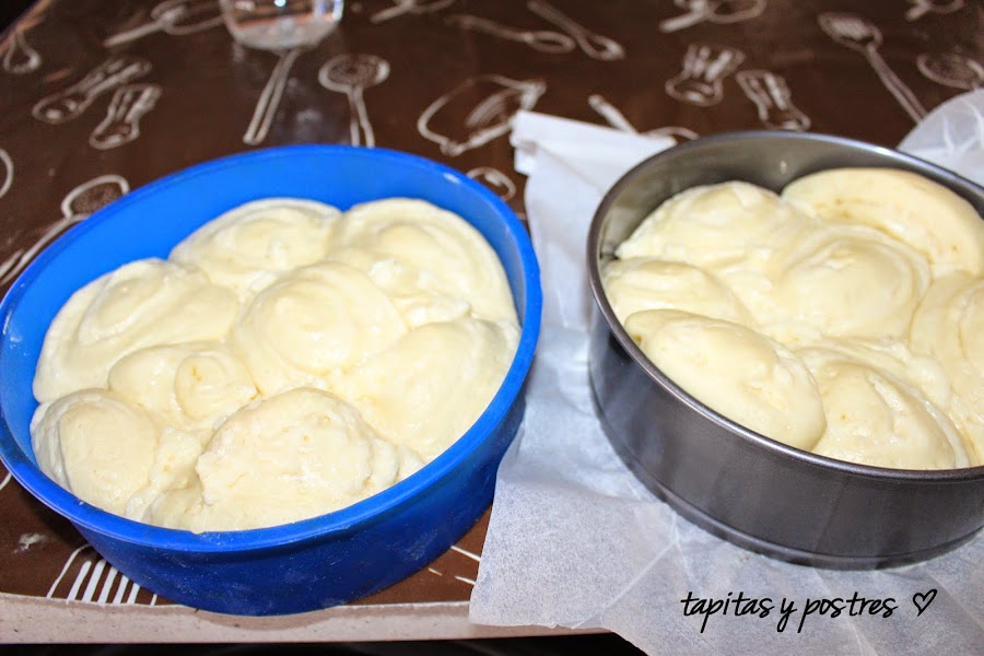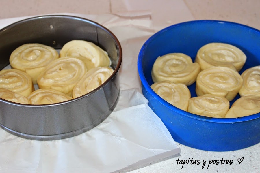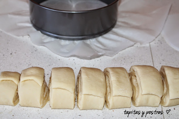 Cortamos ruedas de unos tres dedos de grosor y colocamos en un molde con la parte de la crema hacia arriba. Disponemos en círculo y dejamos que leven un rato, hasta que los huecos se han cerrado.