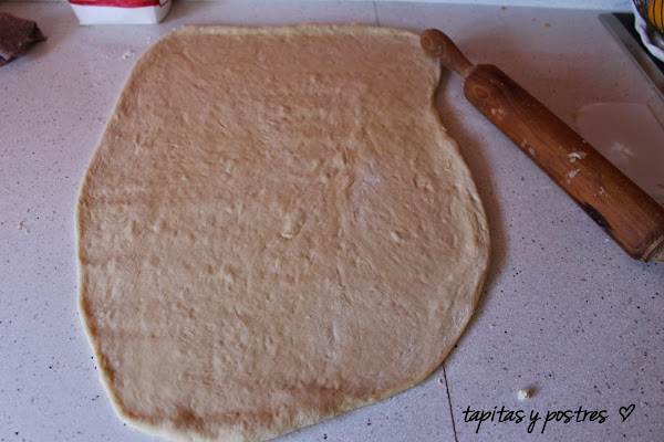 La sacamos a la encimera enharinada y estiramos hasta dar forma de rectángulo.