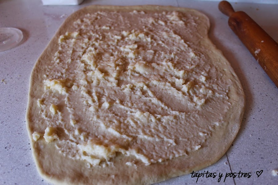 Sacamos y desgasificamos sobre la encimera enharinada. Estiramos con el rodillo hasta dar forma de rectángulo. Extendemos la crema pastelera con una espátula, sin llegar a los bordes y hacemos un rulo largo.