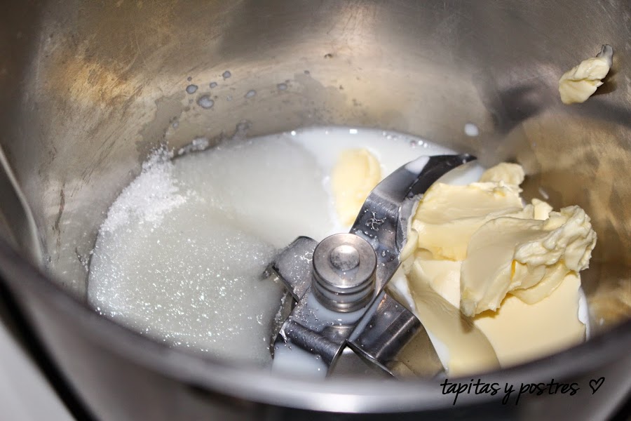 Preparamos la masa, la receta de la crema es muy simple, y no he hecho fotos. Leche, azúcar y mantequilla. Calentamos.