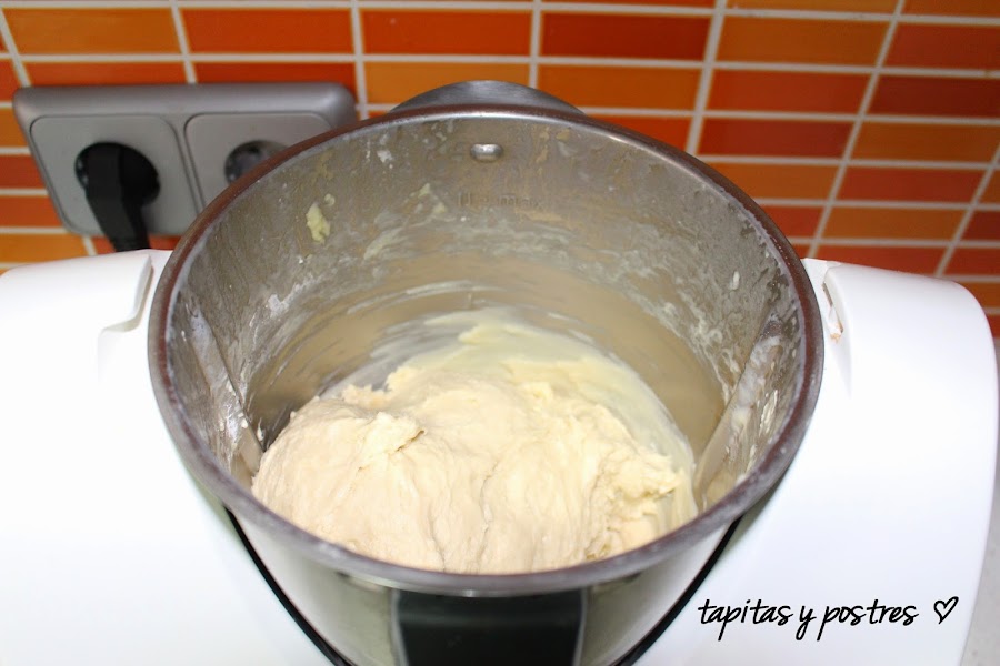 A continuación echamos la harina y mezclamos 20 segundos a velocidad 6 y a continuación amasamos tres minutos a velocidad espiga.