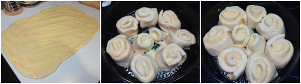 Pasado el tiempo, amasamos ligeramente y estiramos con la ayuda de un rodillo hasta formar un rectángulo de 40x30 cm aproximadamente. Extendemos la crema pastelera por encima y enrollamos como si fuera un brazo gitano. Cortamos porciones de unos 3 dedos de grosor y vamos colocando en un molde desmontable untado con mantequilla. Tapamos y dejamos levar unos 30 minutos más.
