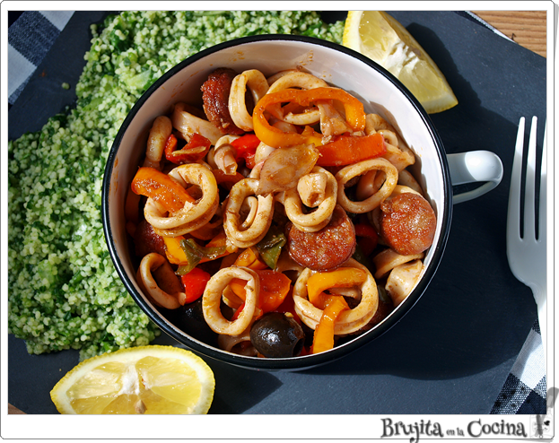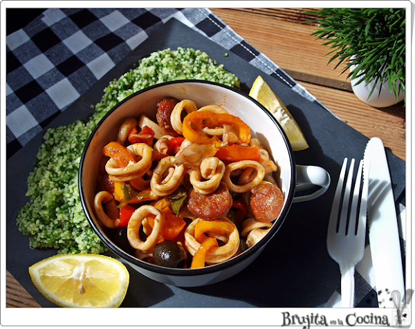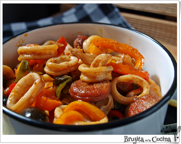 Mientras cortamos los chipirones en rodajas y también el chorizo. Ponemos en una sartén aceite cuando empiece a estar caliente añadimos el chorizo. Quitamos las semillas a los pimientos que cortamos en rodajas, se lo añadimos a la sartén, cuando lleve cocinado unos 4 minutos, entonces agregamos los chipirones, la miel, un chorrito de vinagre. También añadimos los dientes de ajo picaditos, las aceitunas enteras y lo salteamos todo unos minutos más.