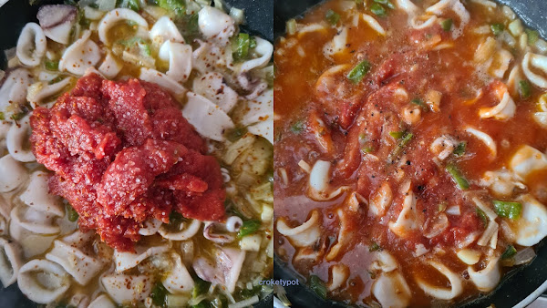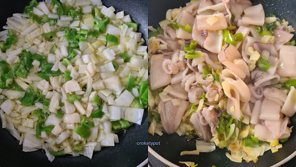 Picamos la cebolla, el ajo y el pimiento, lo pochamos bien y añadimos los calamares, se saltea.