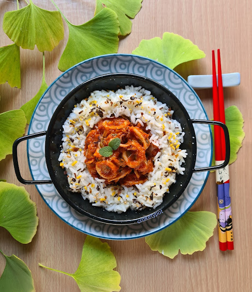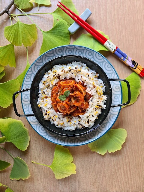 250 g de anillas de calamar, 1 ajo, una cebolla fresca pequeña, un pimiento pequeño, 50 ml de tomate frito casero, 1 guindilla, ¼ de cucharadita de pimentón, 1 cucharada de salsa asiática de pescado,1 una cucharada de salsa de soja (se puede sustituir por caldo de pescado), sal, pimienta molida, aceite de oliva virgen extra. Se puede servir con arroz cocido y furikake.