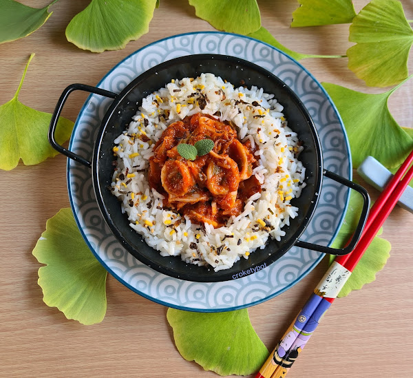 Lo servimos con arroz cocido y furikake que es un condimento japonés a base de algas, sésamo, bonito desecado, entre otras cosas, por que hay muchos tipos de mezclas, que se espolvorea sobre el arroz, sopas o pastas y da mucho sabor.