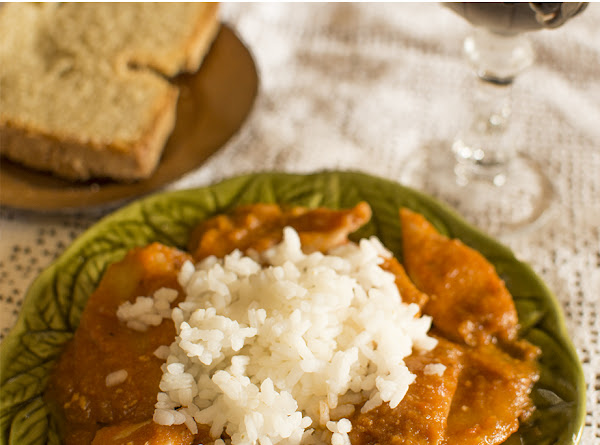 Añadir las dos cucharadas de mermelada y las dos de tomate frito. Remover. Echar el medio vasito de jerez dulce y el caldo de pescado. Remover. Cuando empiece a hervir, probar de sal y repartir la patata cortada en rodajas no muy finas. Dejar hervir hasta que estén hechas las patatas y el caldo haya reducido. Los puedes acompañar de arroz blanco y tienes un plato completo.