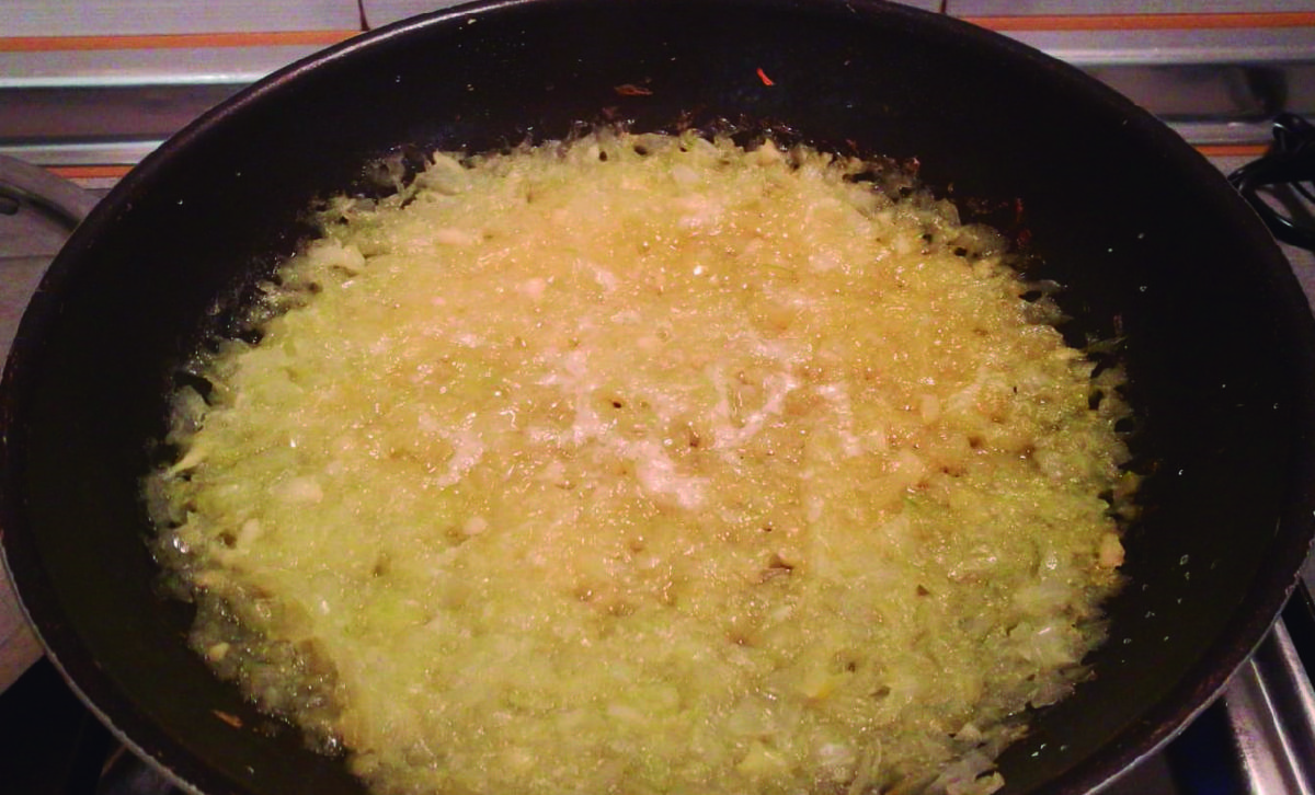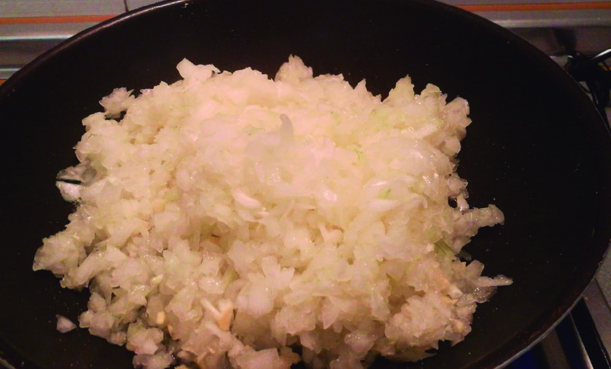 Ponemos la sartén al fuego y echamos la cebolla y ajo picados. Como en otras recetas ya he contado yo pocho la cebolla sin aceite, es decir, echo la cebolla y le echo sal y bicarbonato sódico. Si las cebollas son dulces irán soltando su propio jugo mientras se van pochando y si no son dulces deberemos de echar un poco de agua según se vaya secando la cebolla en la sartén para que no se pegue, ni se queme.