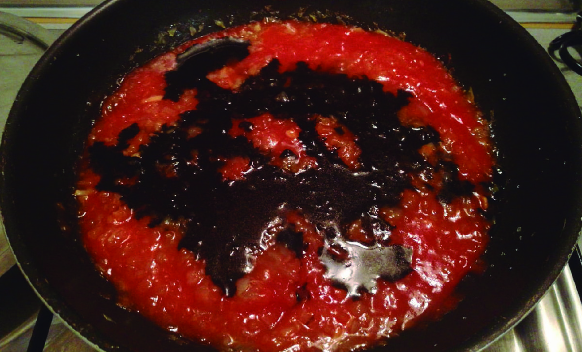 Mientras tanto diluimos la tinta de calamar en un vaso de agua y lo echamos en la sartén. Una vez la salsa ha espesado un poco la apartamos del fuego. Según nos guste la podemos batir o dejar la salsa con los trozos de cebolla. En mi caso no batí la salsa y por eso había dejado la cebolla muy picada.
