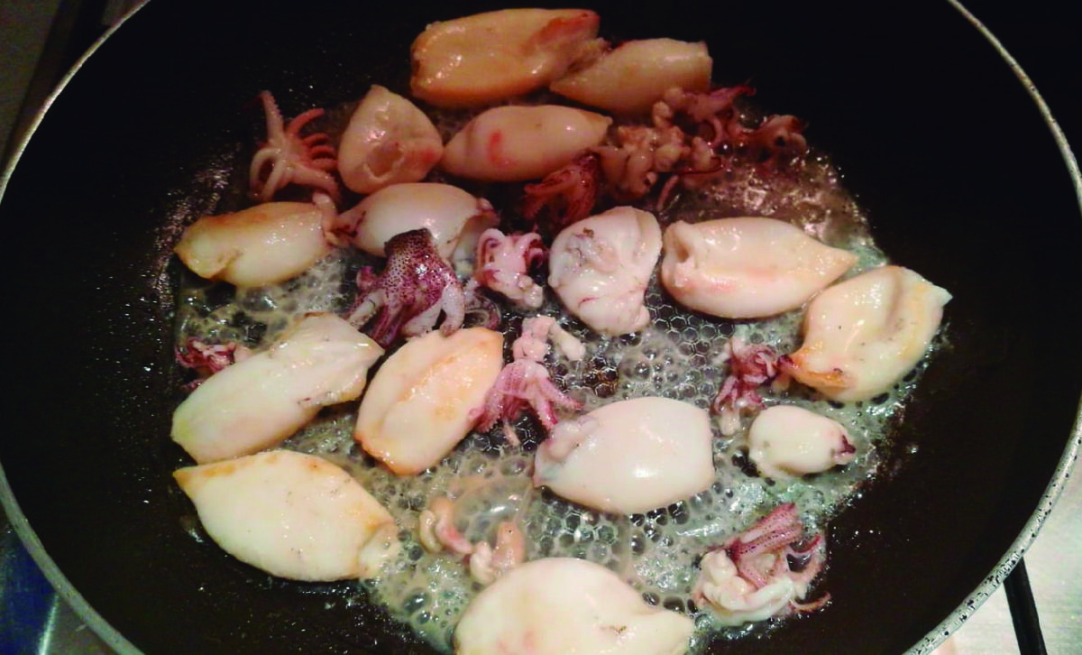 Echamos la salsa en bol a aparte y en la misma sartén echamos un chorrito de aceite (o aceite en spray que se extiende mejor) y doramos los chipirones hasta que estén tiernos, tardarán unos minutos.