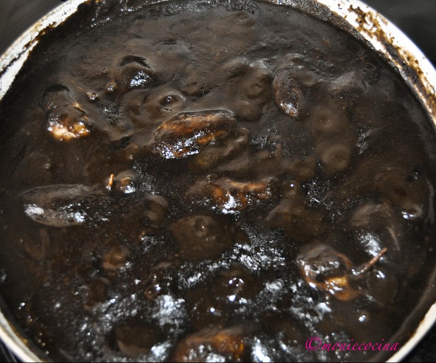 Añadimos el pan picado y la tinta de calamar y cocemos otros 10 minutos. Pasamos la salsa por la batidora para que quede sin tropezones y si hace falta se puede añadir medio vaso de agua si la veis muy espesa. La colocamos en una cazuela.