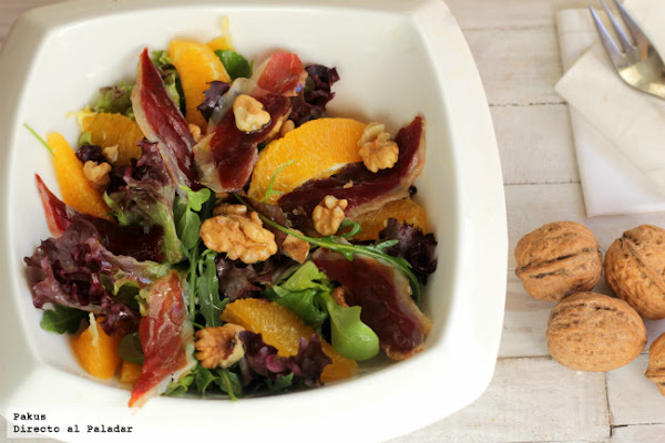 Hace poco hice una ensalada de corujas con nueces, queso de cabra y tomate rallado que nos encantó. También os recomiendo esta ensalada cardiosaludable con salmón noruego, nueces de California y hojas frescas o mi preferida, la ensalada de jamón de pato con nueces de California y naranjas, que muchos recordaréis de haberlas visto en mi muro de Facebook o cuando las publiqué en Directo al Paladar.