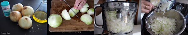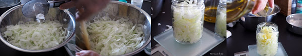 Pelar y cortar las cebollas en juliana (unas 3 cebollas grandes). Colocarlas en un bol y añadir 2 gramos de bicarbonato de sodio, mezclar bien. Repartir la cebolla entre los cuatro tarros, 165 gramos en cada uno, y añadirles 12 gramos de aceite de oliva. Cerrar los tarros con las tapas sin llegar a apretarlas del todo.
