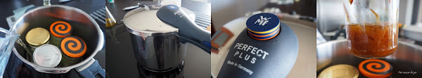 Poner los botes dentro de la olla a presión sobre una rejilla o base, de modo que no estén en contacto directo con el fondo. Añadir agua hasta alcanzar una altura de 2,5 centímetros. Cerrar la olla y colocarla en el fuego. Cocer a 1 bar de presión durante 40 minutos, contados a partir del momento en que alcanza la presión. (Es conveniente seguir las instrucciones de la olla que utilicéis).