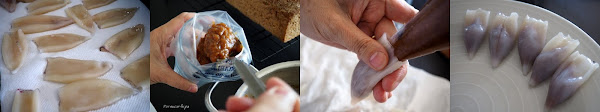 Colocar la cebolla caramelizada en una manga pastelera. Ir rellenado los chipirones hasta unas tres cuartas partes más o menos. Colocar las patas reservadas en los chipirones de manera que sobresalgan un poco.