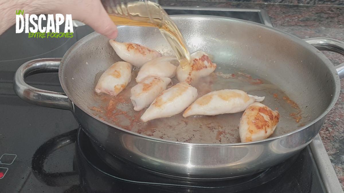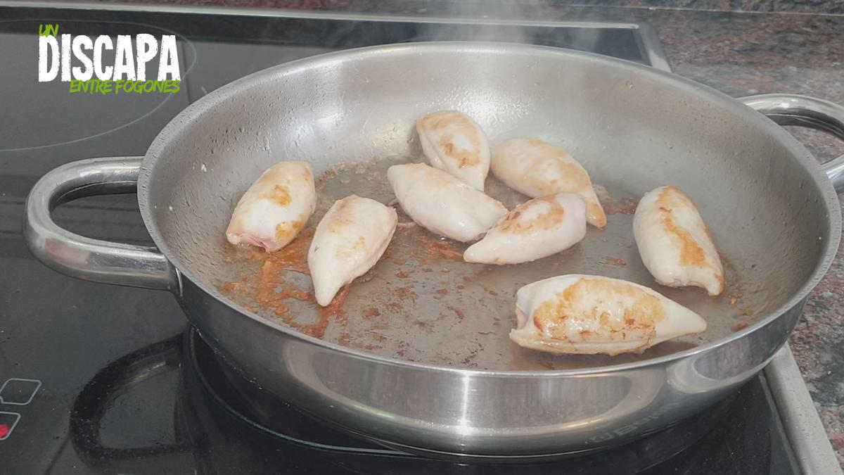 3Una vez que tenemos la cebolleta pochada reservamos. Después en una cazuela añadimos un chorrito de aceite y dejamos que se caliente a fuego fuerte. Cuando el aceite ha cogido temperatura añadimos los chipirones y dejamos que se doren.