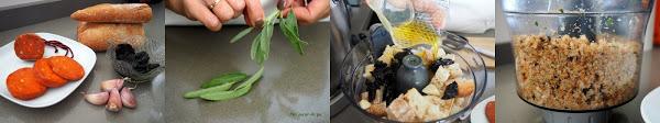 En la picadora o en el procesador de alimentos, colocar el pan troceado, los dientes de ajo, sal, los tomates secos, la salvia y el aceite de oliva. Triturar hasta obtener una mezcla desmenuzada. Reservar.