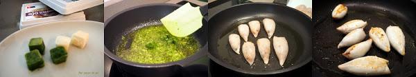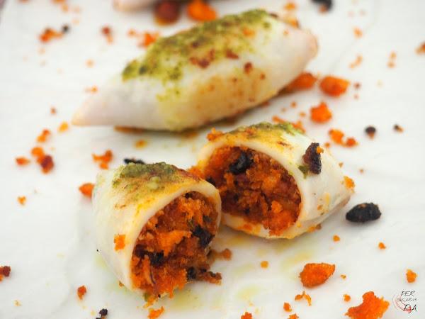 En una sartén o plancha antiadherente a fuego medio colocar unas gotas de aceite de oliva y cocinar los calamares ya rellenos como si los hiciéramos a la plancha. Cuando empiecen a tener su tradicional costra dorada los retiramos.