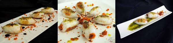 Para emplatarlos podemos jugar con las texturas y el color de las migas y la picada de ajo y perejil, y diferentes formatos y distribuciones según sea tapa, entrante o plato. El corte ya veis, espectacular.