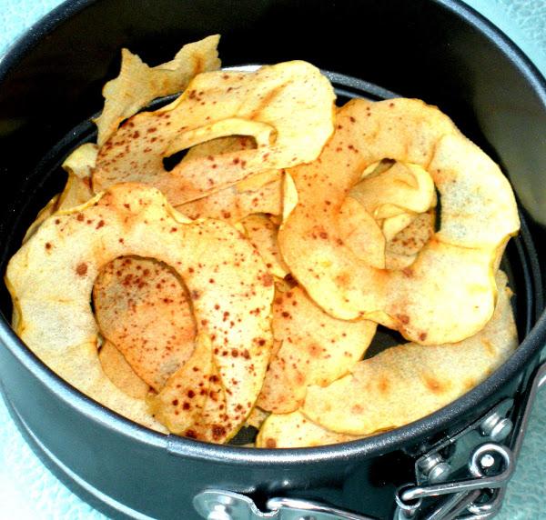 Vi estos chips de manzana en el blog de Marta "Dolce far Niente" y aunque pensé que no me iban a salir, después de una primera tanda que se me quemó enterita, la segunda quedo bastante aceptable. No tan bonitos como a ella, pero estaban crujientes y muy ricos.