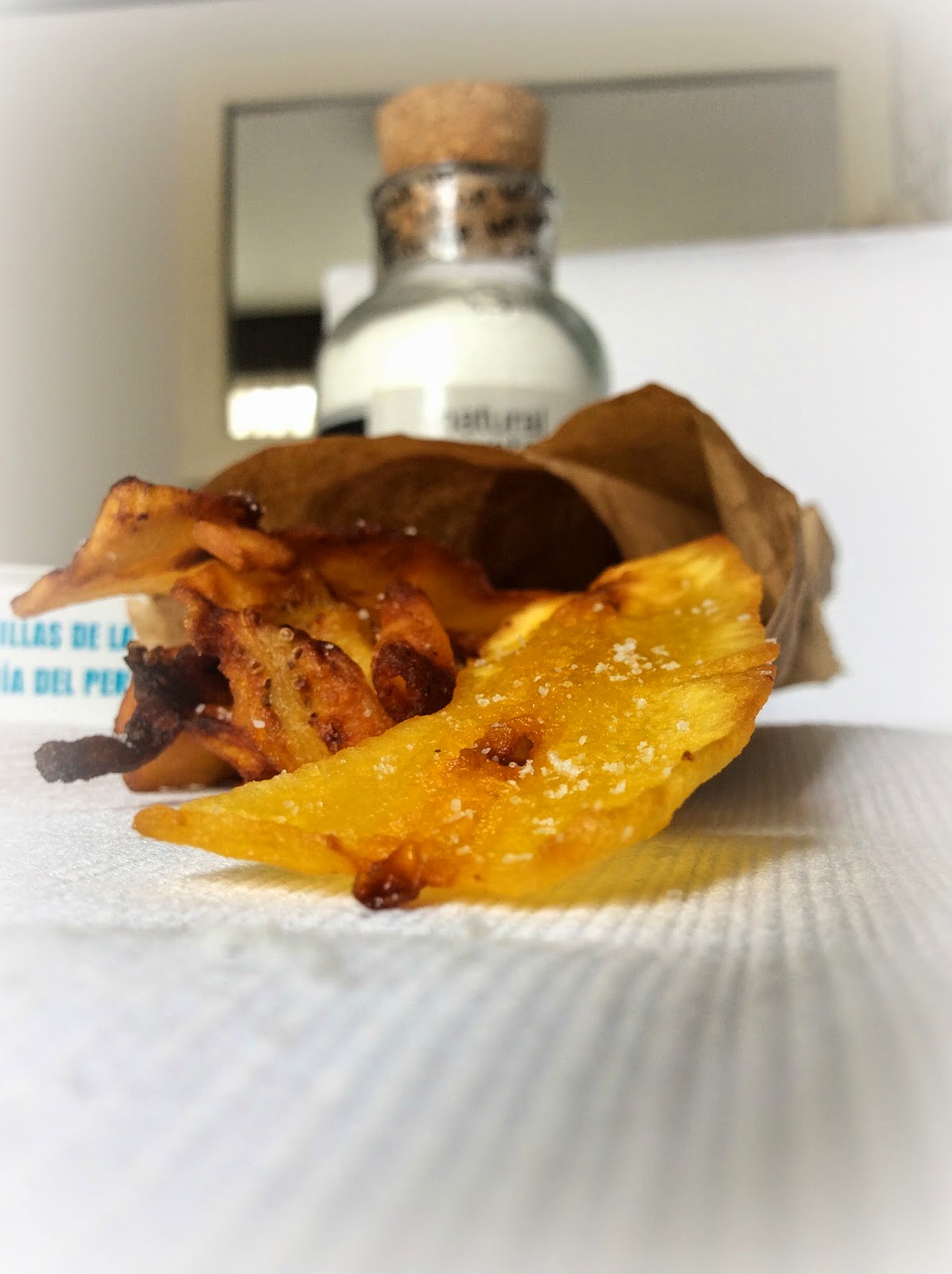Los chifles, como los llaman aquí los limeños, no son mas que chips de plátano frito en aceite vegetal y un poco saladitos. Si queréis que los peques coman fruta, ésta es una buena manera de hacerlo. Los devorarán antes de que lleguen a la mesa. He de decir que he probado los que venden ya en paquetitos y no tienen nada que ver. Lo digo por si alguno los ha comprado y dice que no le gustan. No me extraña porque esos no saben a nada, más bien parece que estás comiendo plástico.