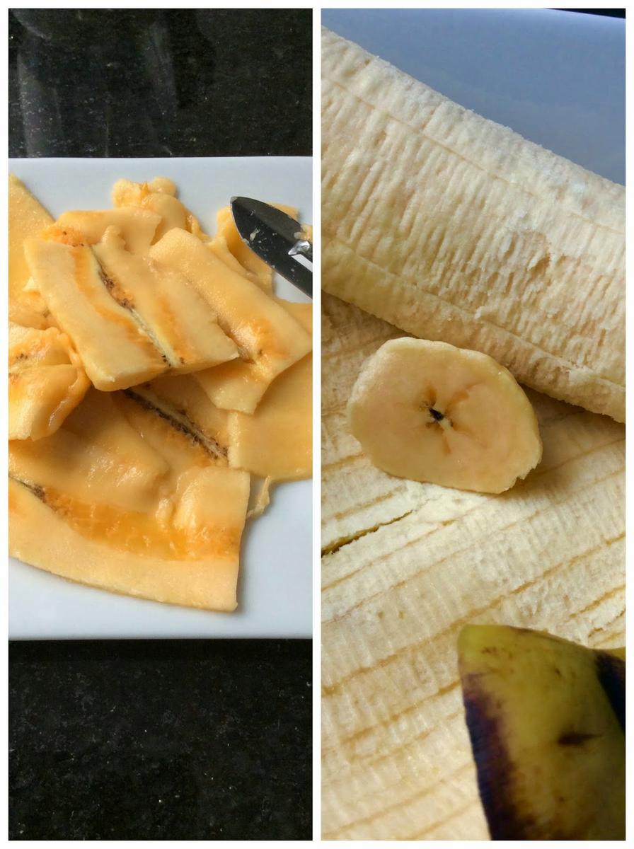 * Aquí en Perú hay bastantes variedades de plátano. Yo utilicé el plátano palillo, que es un plátano muy grueso, recortadito, no es largo como la banana que nosotros conocemos, y por dentro es de color anaranjado y al freírlo se pone amarillo. Se puede hacer con nuestros plátanos también. El que el plátano esté verde, facilita el que se pueda cortar a láminas finas. En mi caso, estaba un poco maduro y se partía, pero con todo y con eso, lo conseguí.