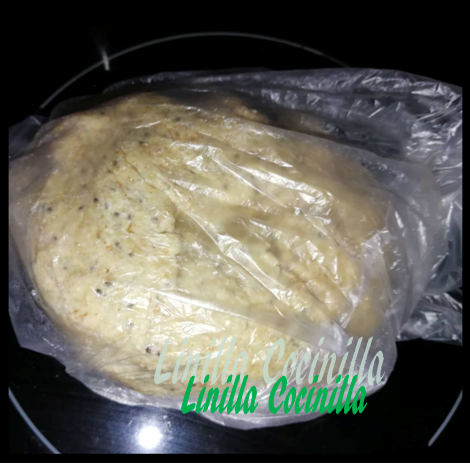 3. Ponga la masa sobre la superficie de trabajo espolvoreada con harina y amase espolvoreando harina hasta que no se pegue en las manos. Deje reposar la masa aprox. 30 minutos dentro de una bolsa de plástico (o bol hermético) para que no se seque.