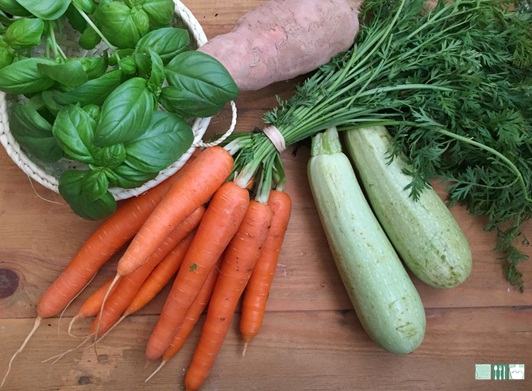 En la foto de izquierda a derecha, primero unas CINTAS DE ZANAHORIA Y HOJAS DE ALBAHACA: