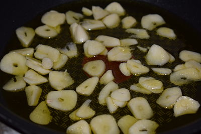Pon aceite a calentar en el fondo de una sartén. Agrega los ajos pelados y laminados.