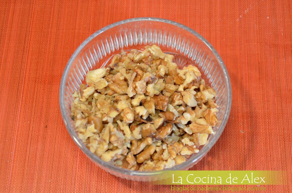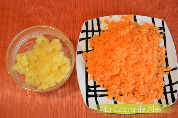 Pelamos las zanahorias y la cortamos en trozos no muy pequeños, cortamos la piña más o menos del mismo tamaño y picamos las nueces.