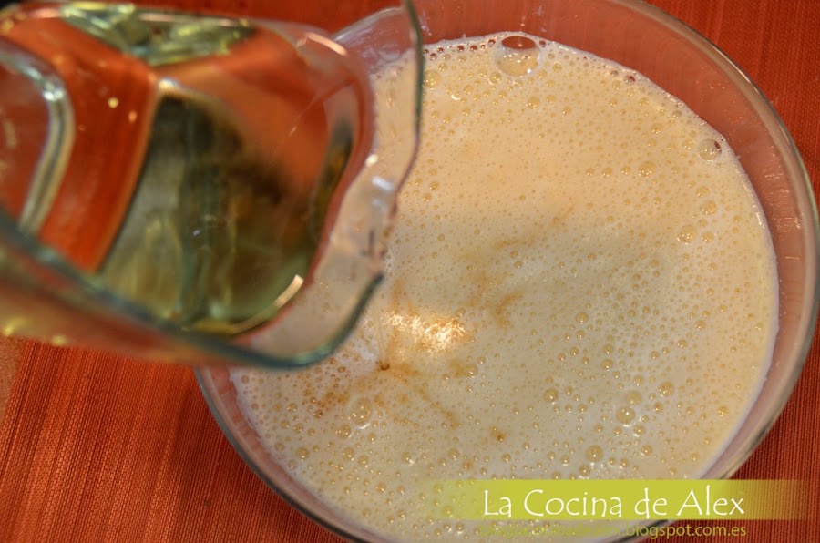 Añadimos a los huevos la esencia de vainilla y el aceite de girasol y seguimos batiendo hasta incorporar todo.