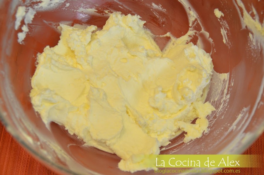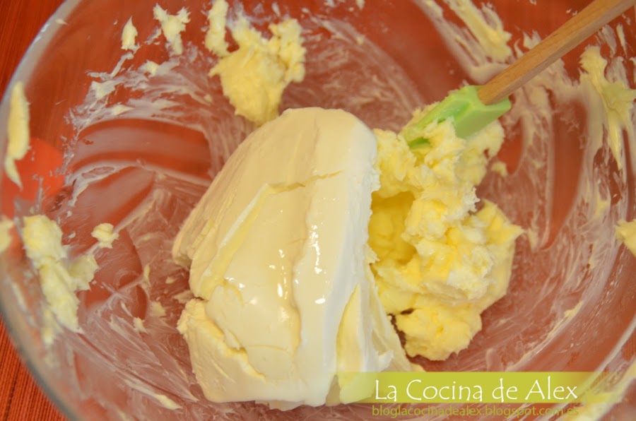 En un bol ponemos la mantequilla en pomada junto con el queso crema y batimos hasta que se mezcle todo bien.