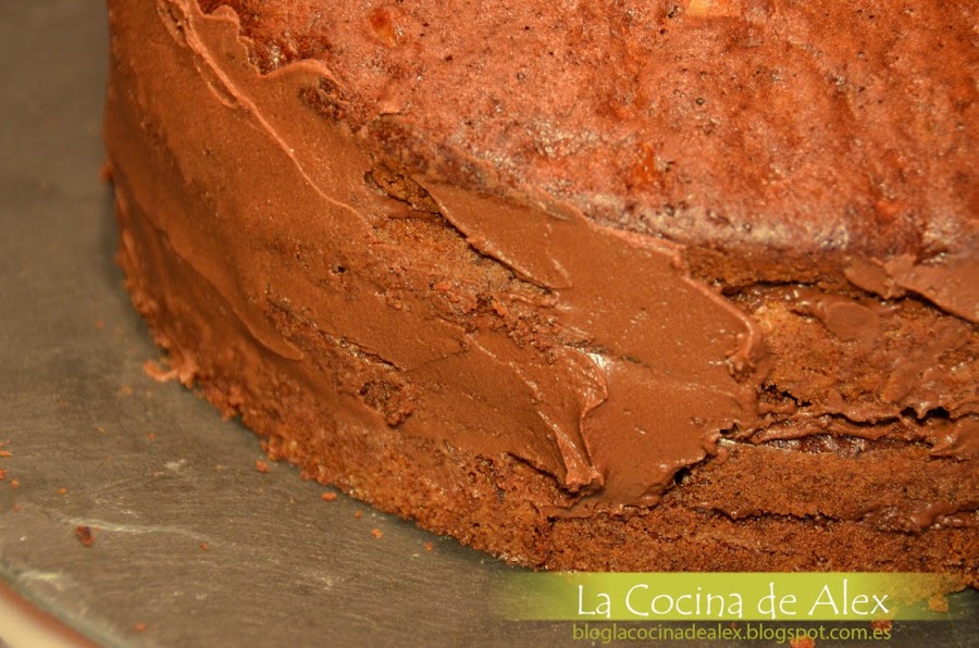 Para el montaje de la tarta, una vez están fríos los bizcochos los abrimos por la mitad y los rellenamos con una buena capa de frosting, volvemos a cerrar los bizcochos, ponemos frosting encima de uno de ellos y ponemos encima el otro bizcocho, consiguiendo de esta forma 3 capas de frosting. Si solo habéis usado un solo molde, solo tendréis que hacer 3 cortes al bizcocho y rellenarlo para obtener el mismo resultado.
