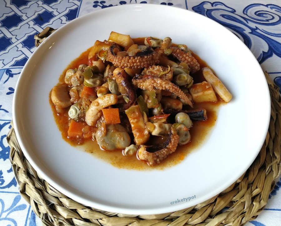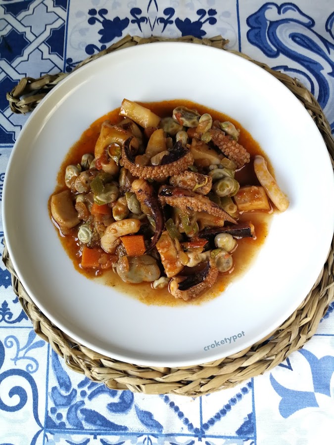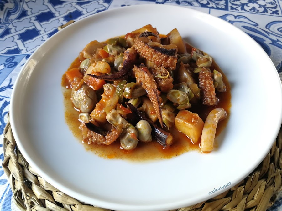 En esta receta, el choco, unido a unas habas frescas pequeñitas, ya nos podemos imaginar el resultado, es pura cocina mediterránea.