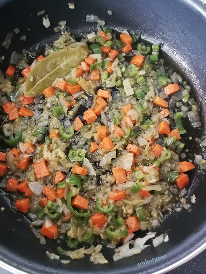 ELABORACIÓN: En una olla o cazuela ponemos aceite, la cebolla, la zanahoria, el laurel y el pimiento todo picado, dejamos que se haga.