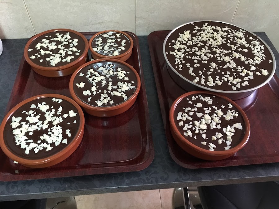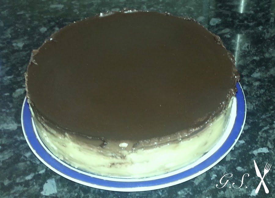 Vertemos la crema de chocolate encima de la tarta, dejamos reposar un poco y lo metemos a la nevera para que cuaje.