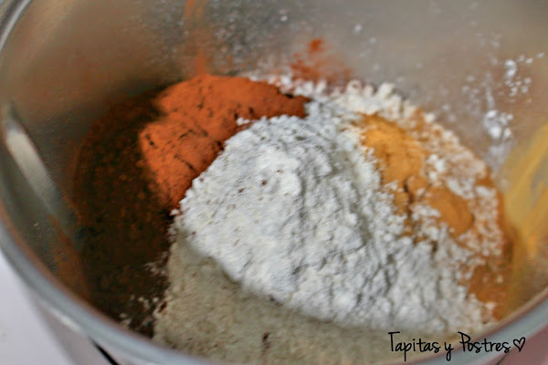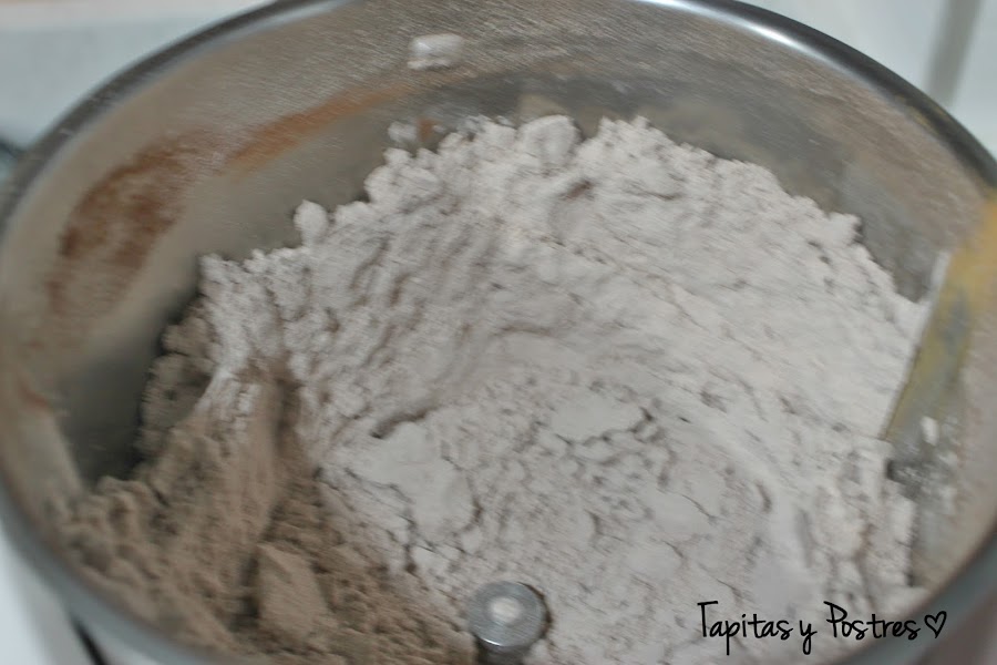 Ponemos en el vaso de la thermomix los ingredientes en polvo (harina, sal, cacao y canela, excepto el azúcar) y lo tamizamos 15 segundos a velocidad 5. reservamos en un bol.