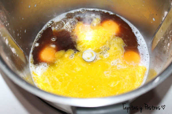 Agregamos los huevos, la mantequilla fundida, el azúcar, la vainilla y el licor de café (yo he puesto agua y café soluble y lo he hervido, y ya frío lo he añadido a la receta). Mezclamos 30 segundos a velocidad 2.