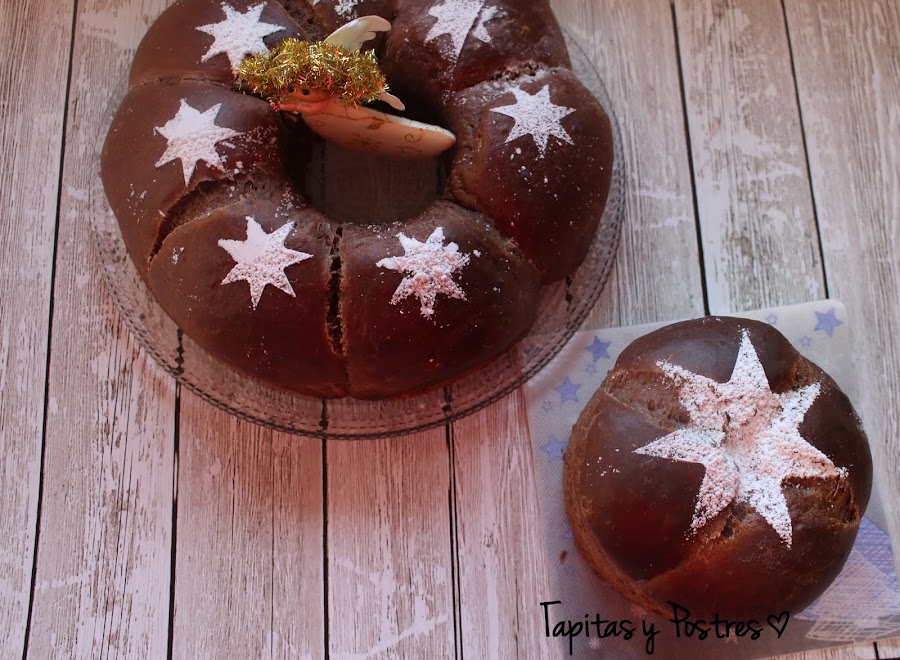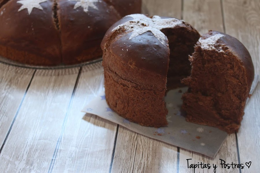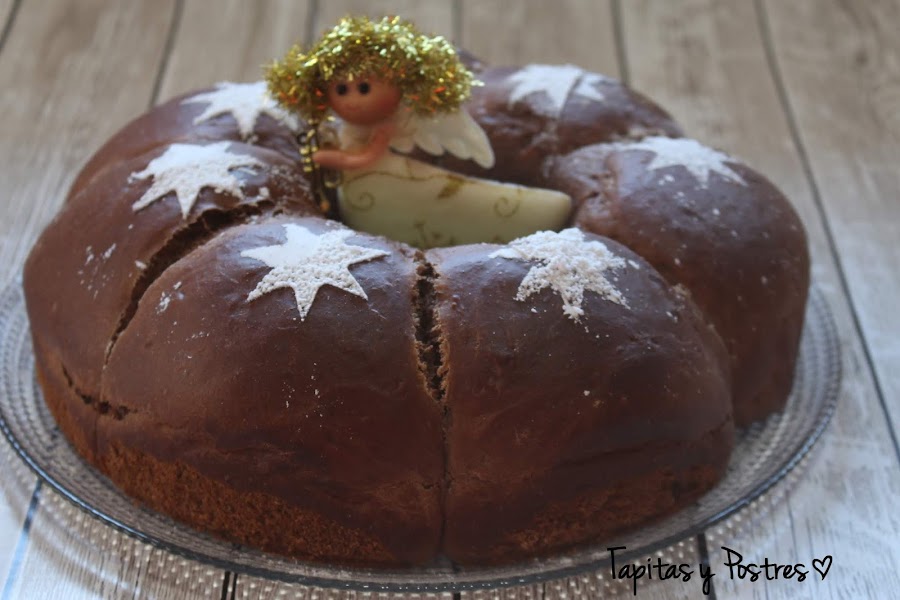 Aunque la receta la he seguido a través de la revista oficial, la autora de este dulce es Kanela y Limón que lo llama Roscón de Reyes de chocolate. Su versión es sin duda más apetitosa pues lleva una cobertura de chocolate y bolitas de cereales chocolateadas por lo que la cantidad de azúcar es más que suficiente. Pero en esta versión sin cobertura era necesario (para mi gusto) aumentar la cantidad de azúcar.