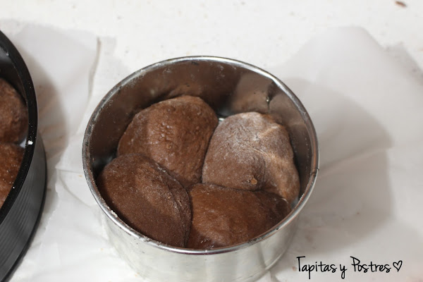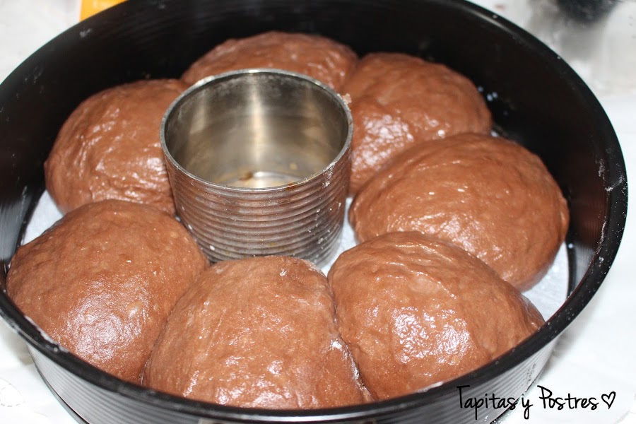 Hacemos las bolas y las colocamos alrededor de un aro en un molde de unos 26 cm
