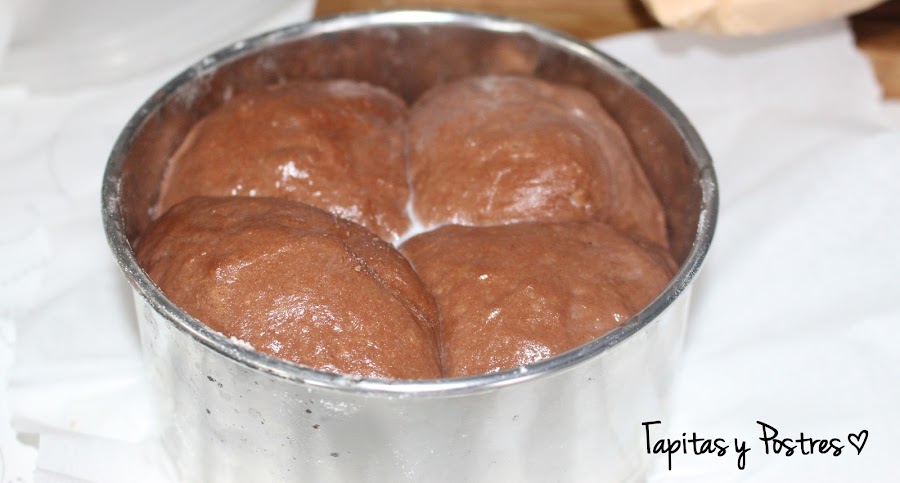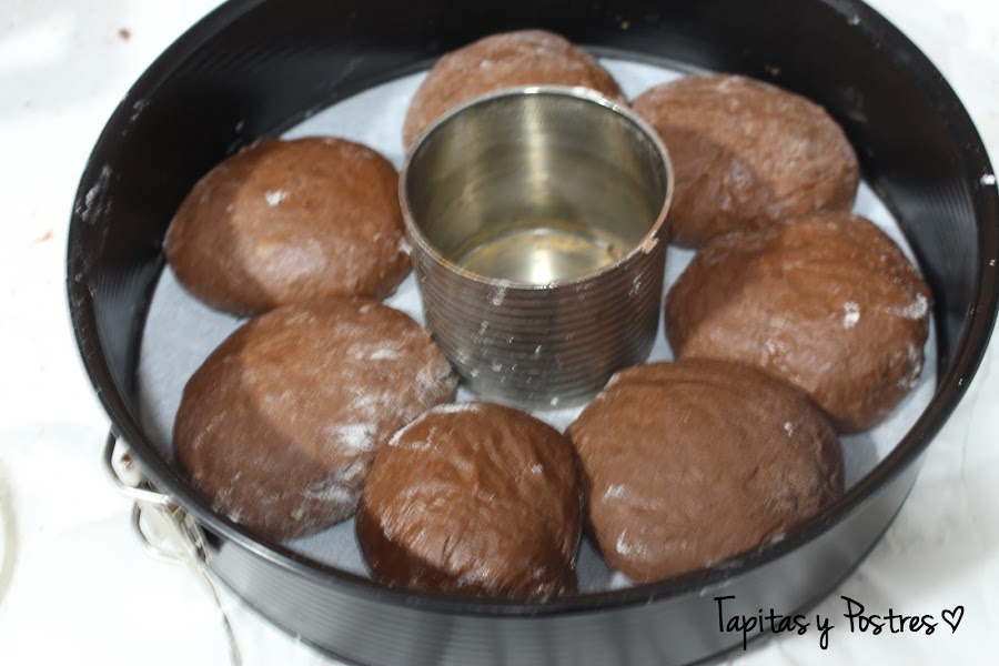 Poned cada bola de un peso similar, las mías eran de 95-100 gr. En el centro del molde ponemos un aro de emplatar engrasado y ya montado pintamos con leche y dejamos que leve un par de horas, hasta que veamos que ha crecido.