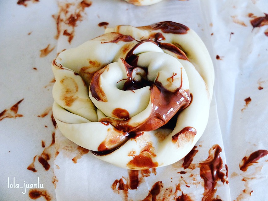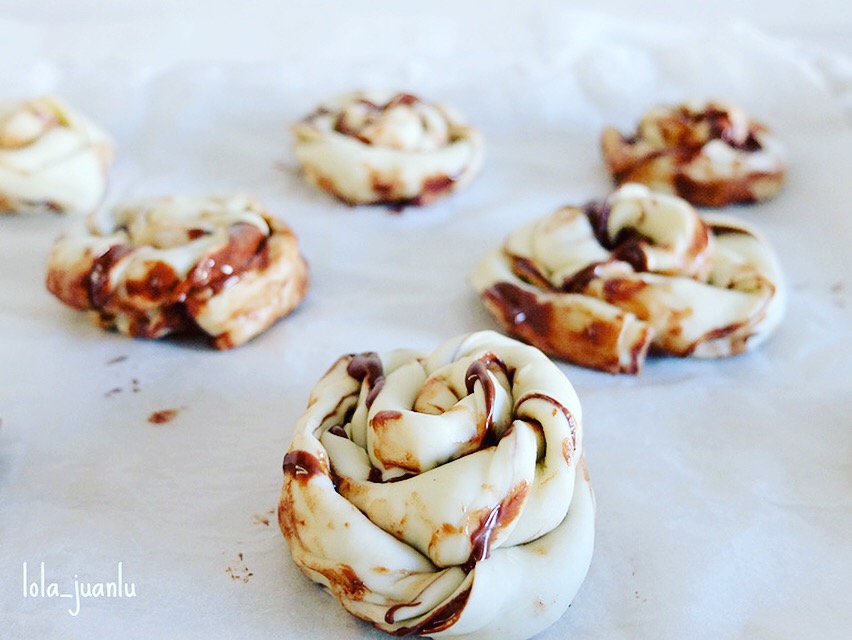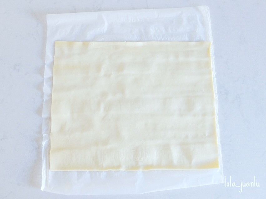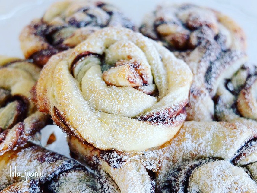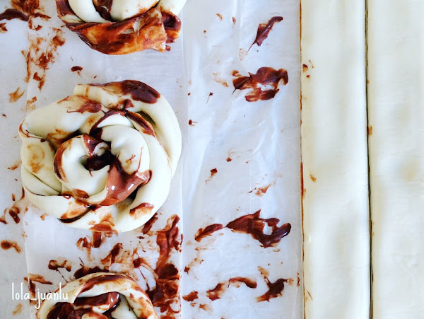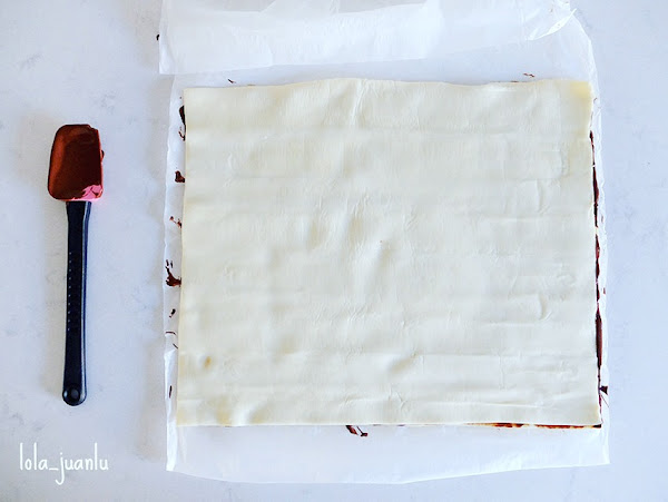 Colocamos una lámina de hojaldre y extendemos el chocolate sobre ella. Es importante que esperemos a que se enfríe un poco el chocolate fundido antes de untarlo o se ablandará el hojaldre y no podremos manipularlo bien.