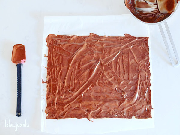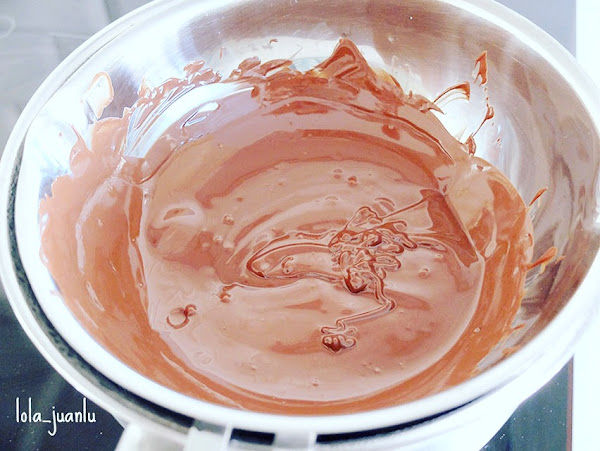 Fundimos el chocolate, lo apartamos del fuego y lo dejamos atemperar. Suelo fundir el chocolate al baño María.